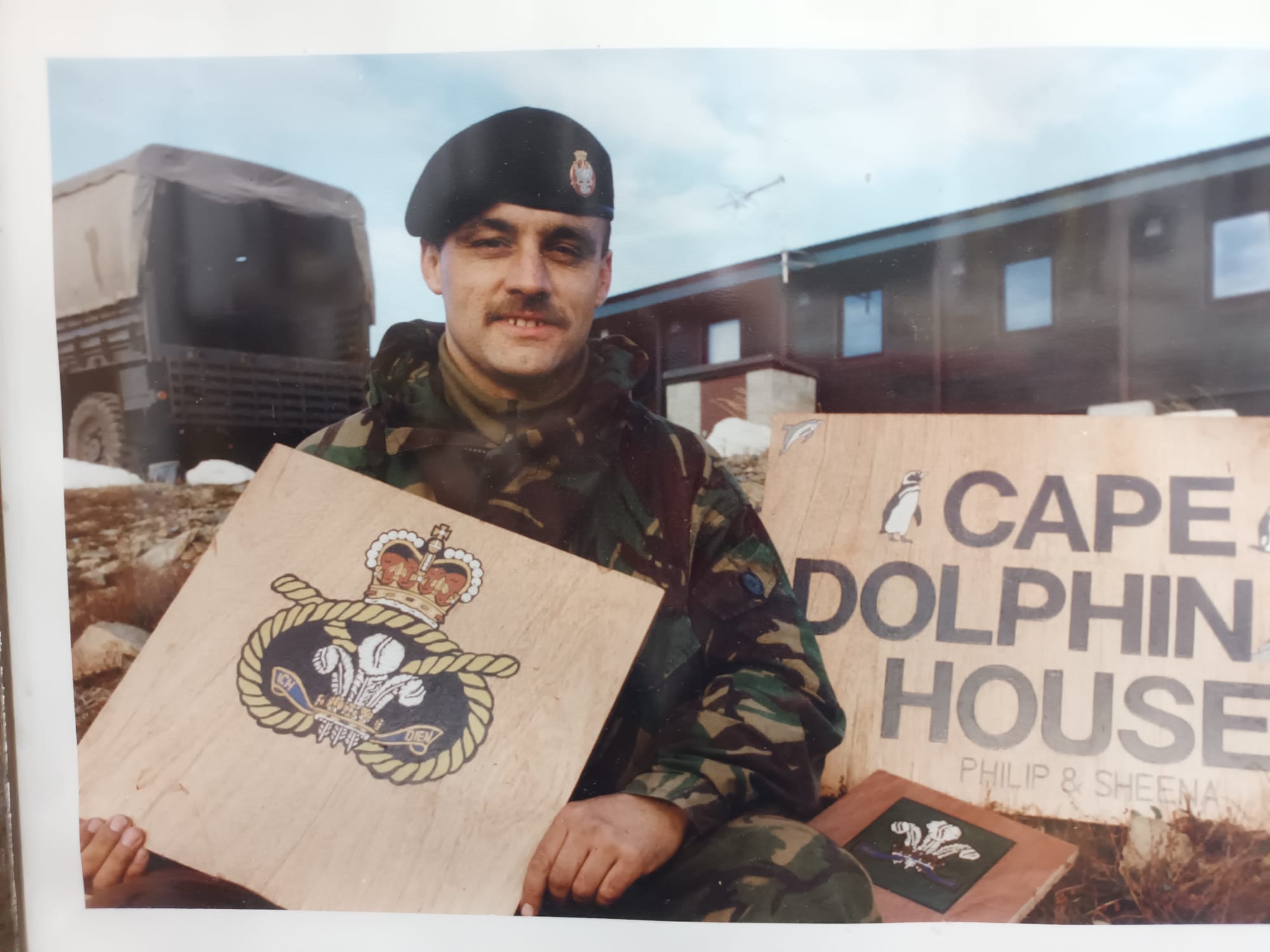 • A painted or engraved military crest at the centre, consisting of a crown above a rope circle enclosing a plume of feathers with scrolls bearing a motto.